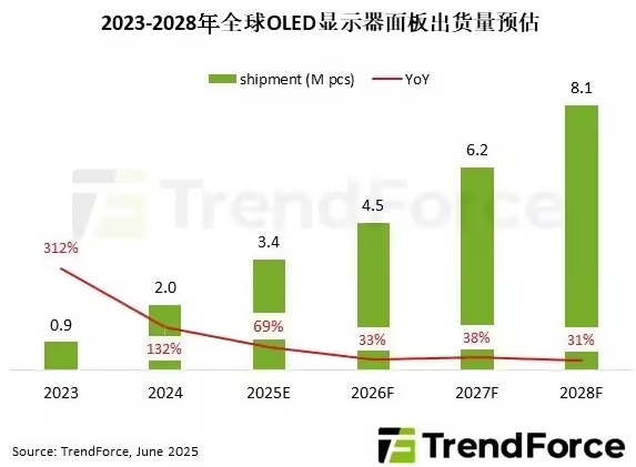从需求面观察,华硕、微星等电竞品牌大力推广OLED显示器产品,于五月的COMPUTEX均展出27吋500Hz的QDOLED电竞产品,两家公司2025年的OLED显示器面板需求量也将翻倍成长。其中,华硕的需求量预计将突破50万片,其同时推广QDOLED及WOLED显示器,对WOLED面板需求大增,是促使LGD对OLED显示器面板态度转趋积极的关键之一。